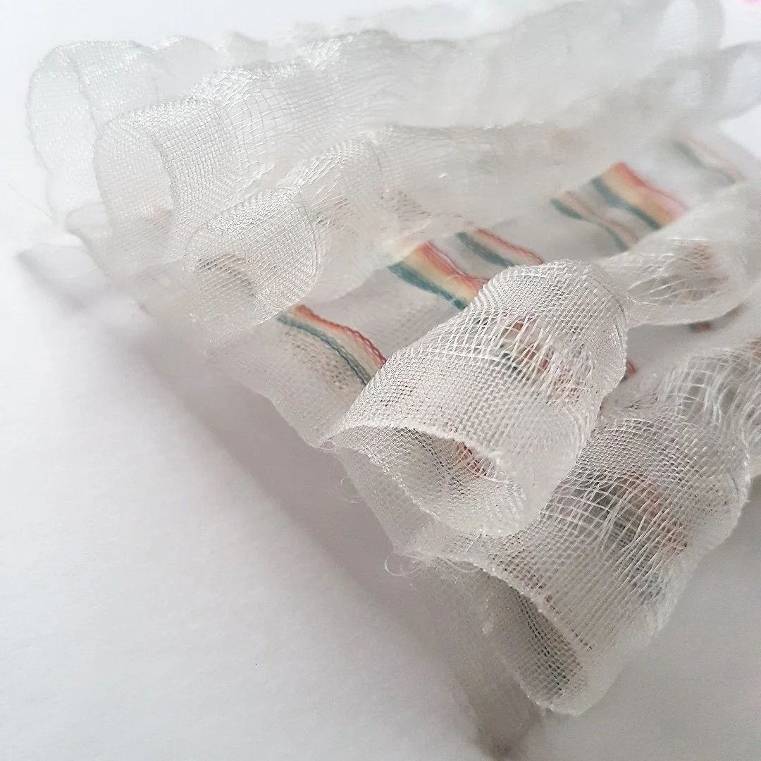 For this project I explored methods of capturing light and found inspiration through the sudden strike of colour bursting through the monotone architectural appearance of a glass prism. This series of experimental, structural samples, mixes transparent and opaque layers, echoing the appearance of light passing through a prism. These sculptural woven textiles incorporate mixtures of transparent, reflective nylon monofilament fibres combined with the opacity of luscious hand-dyed silk. As screens and room dividers, featuring experimentation with doublecloth, exaggerated pleats and floating threads, these pieces are intended to separate space and invite people to move through it, guiding them to move through the room.